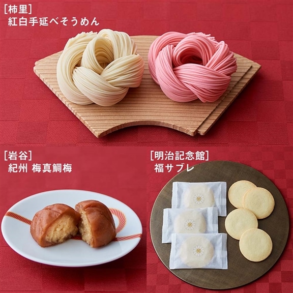 干支をモチーフにしたお菓子やお惣菜など、縁起の良いアイテムを詰め込んだ「招福ボックス」は、人気の商品を少しずつお試しいただける特別でお得なセットです。婦人画報限定のパッケージデザインでご用意した『柿里』の紅白手延べそうめんに、ハレの日にふさわしい『岩屋』の「紀州 梅真鯛梅」、『明治記念館』から婦人画報のお取り寄せで初お目見えとなる「福サブレ」、絵馬形の箱に入った『赤坂柿山』のおかきの詰め合わせ「招福多福」、干支のイラストボックスにはいった『ウチュウワガシ』の干菓子「ochobomini2026干支ボックス」、絵馬をかたどった『まめや金沢萬久』の干支の型抜きバウムと、年末年始にぴったりのおめでたい人気商品が6種類。