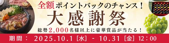 日頃の感謝の気持ちを込めて、10/1より「大感謝祭」キャンペーンを開催中!季節の贈り物やご自宅用のおまとめ買い、この時期のおせちのご予約など、ぜひこの機会にご利用ください。詳しくはこちらから>>