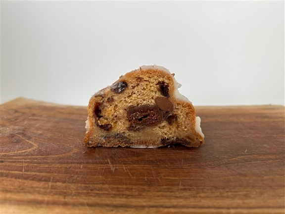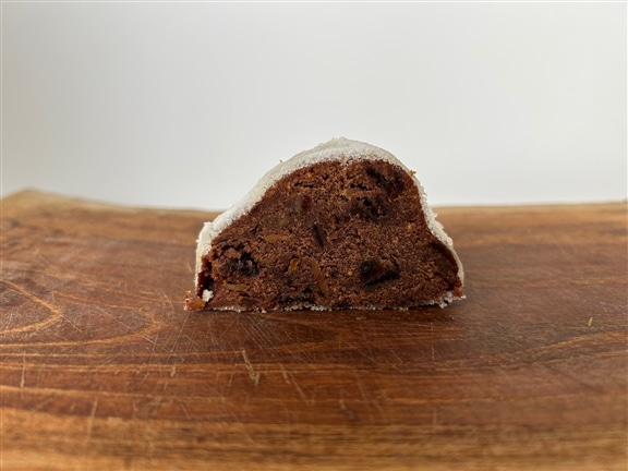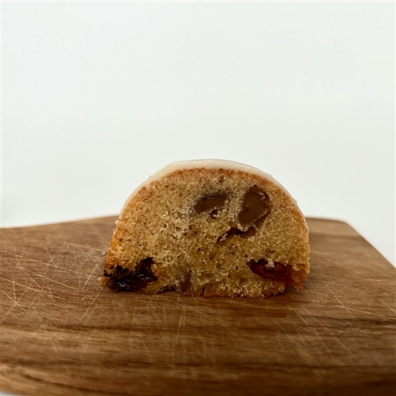 お味は”THE シュトーレン”というよりも、バターケーキのシュトーレン味とお伝えするのがわかりやすいかと思います!バターケーキの中に、クランベリーにレーズン、クルミと、4種のスパイスがほんのりと入ったシュトーレン風♪スパイスたっぷりが苦手な方に喜んでいただけるお味になっています。上のコーティングも粉糖ではなくホワイトチョコなので、まろやかな味わいで皆さまに愛されるお味に仕上がっています。