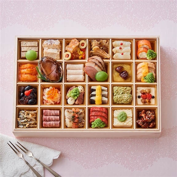 おせちの定番である「かまぼこ」や「伊達巻」はもちろん、人気の「数の子入り松前漬」や「本まぐろと昆布の煮物」、新たに「小鯛と野菜の昆布〆」や「のど黒のごぼう包み焼」などの新品目も登場。ひとりひとりに寄り添いながら、山海のご馳走を存分にご堪能いただけるおせちに仕上がりました。贈り物やご家族でのシェアにもおすすめです。