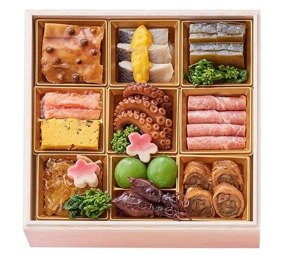 和と洋、それぞれの魅力をたっぷり詰め込んだ、バランスの良い三段重です。定番の縁起物に加え、お酒にも合う趣のある和の味わいと、洋食の華やかさをともに楽しめる、贅沢な構成と