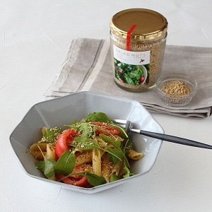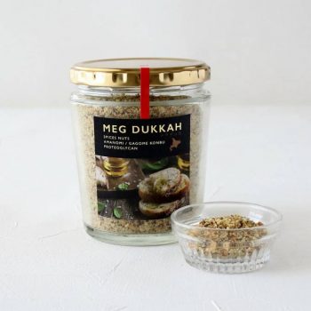 「デュカ」とは、中近東でポピュラーなナッツとスパイスを合わせた調味料。アラビア語で「つき砕く」という意味だそうです。このメグデュカは北海道・札幌でフードスタイリストとして商品開発などを手掛ける大川和恵さんが道産食材を生かして作った商品。クラッシュしたアーモンド、カシューナッツ、クルミに、クミンやローズマリーといったスパイス、さらに北海道産の亜麻の実、フコイダン豊富ながごめ昆布、稀少価値の高いプロテオグリカン。この全表示ラベルを見たら気になって思わずポチってしまいませんか?
